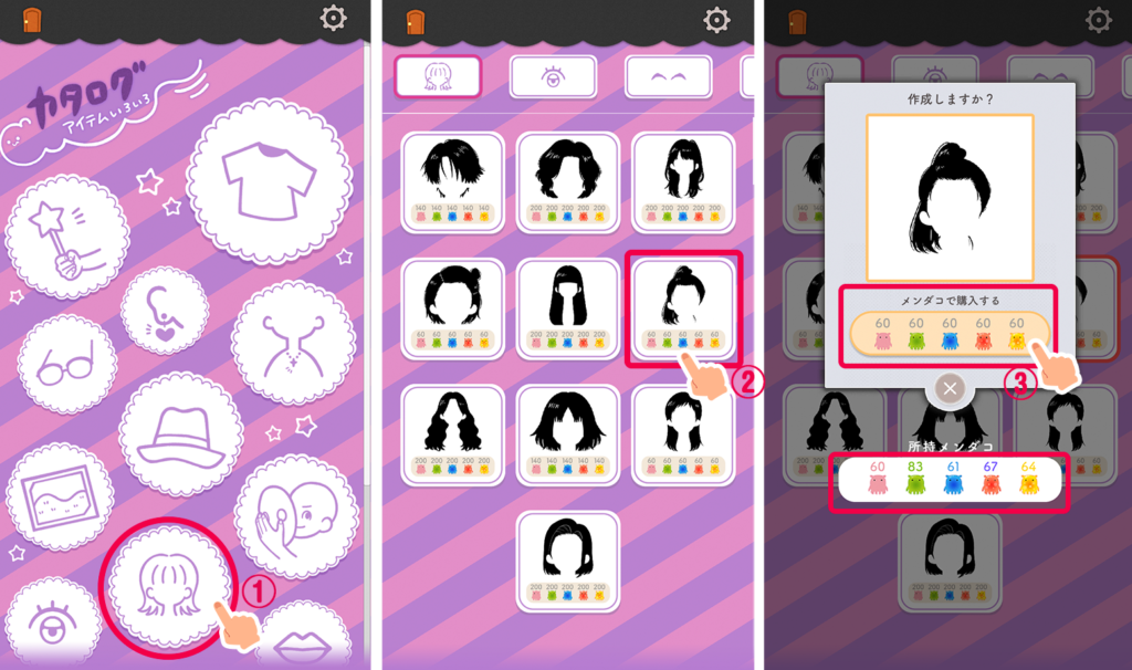 ②作りたい髪型をクリック(必要なメンダコ数が表示されてるよ)